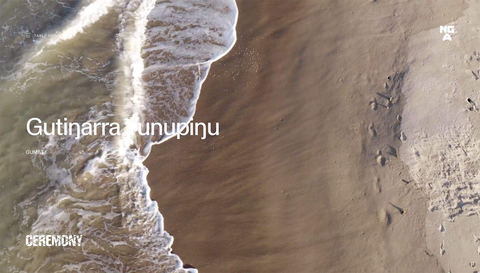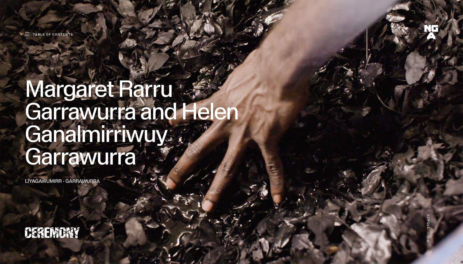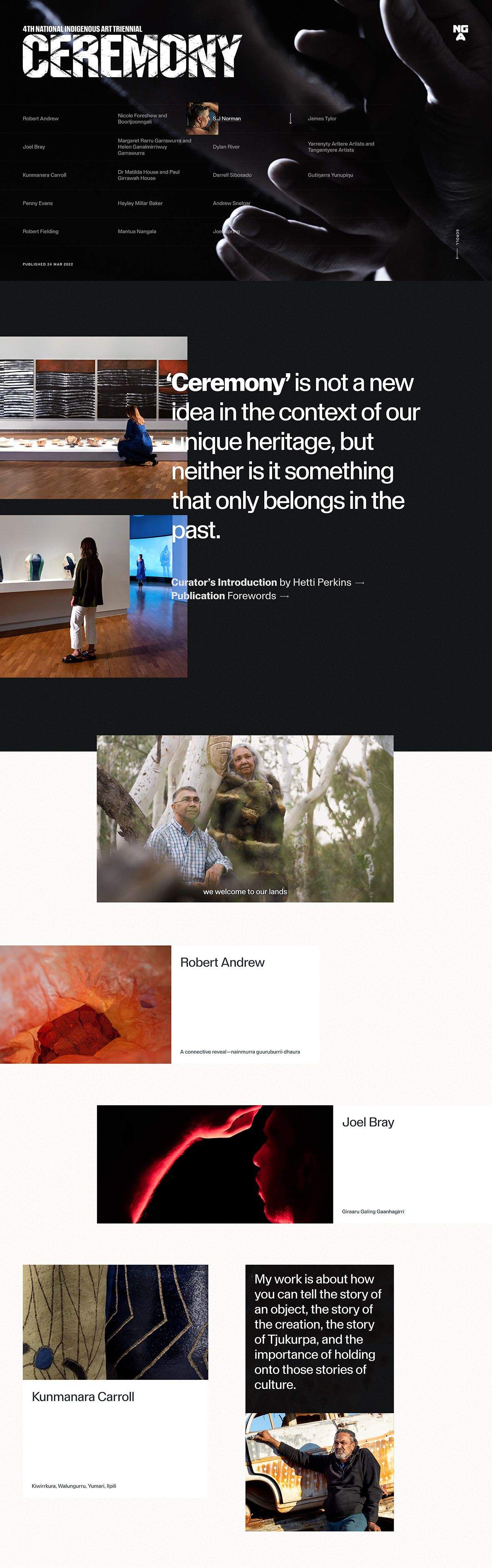 For its Ceremony exhibition, the NGA commissioned us to reframe the publication as a living and breathing reflection of art, presented through the story of the artist. A digital publication, if you will, but something more than a reinterpretation of a venerated media format. It wanted to give the artist another platform to show their intent, to unravel how they see ceremonies in their own lives and communities. A space to speak in their own voice, on their own terms and in their own language.