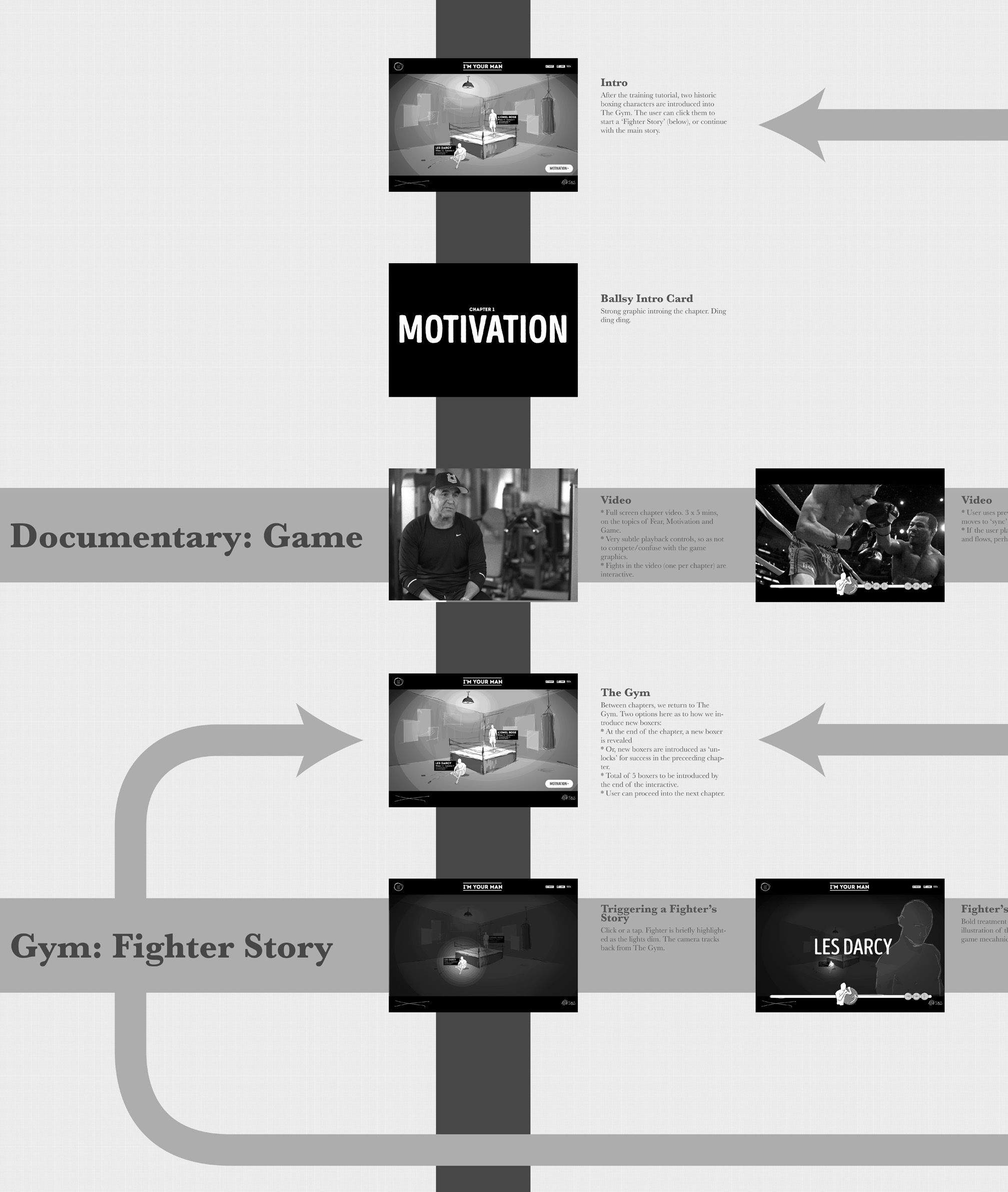 I’m Your Man is totally unique. Using illustration, interactive video, gesture-based interface, and a 3D engine, this hybrid project allows the user to control and feel every punch. To do so required blending unlikely disciplines of filmmaking and game development.