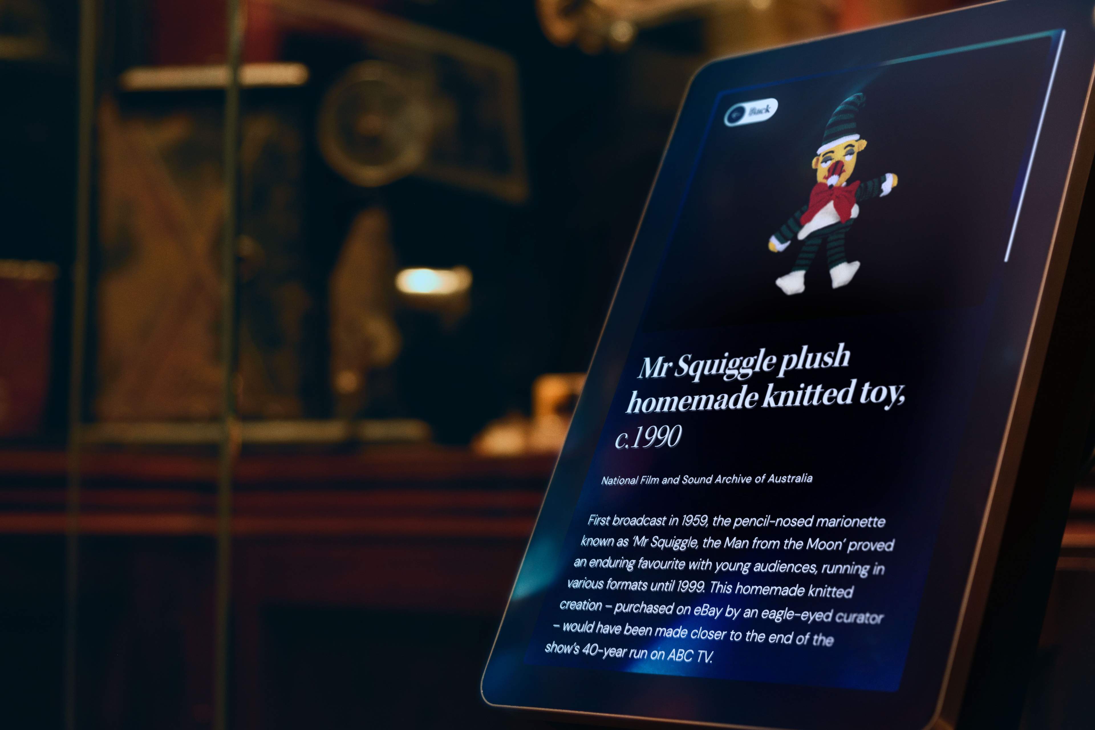 Within the meticulously restored art deco interior, and amid a dense array of objects, the screens consolidate curatorial interpretation in place of individual object labels. They allow visitors to seek context for each artefact while, through their own design, creating a dreamy atmosphere that complements the exhibition.
