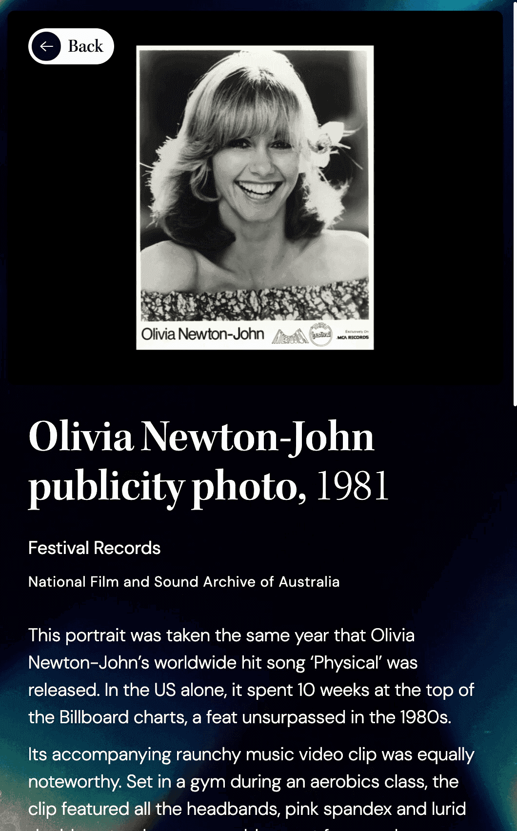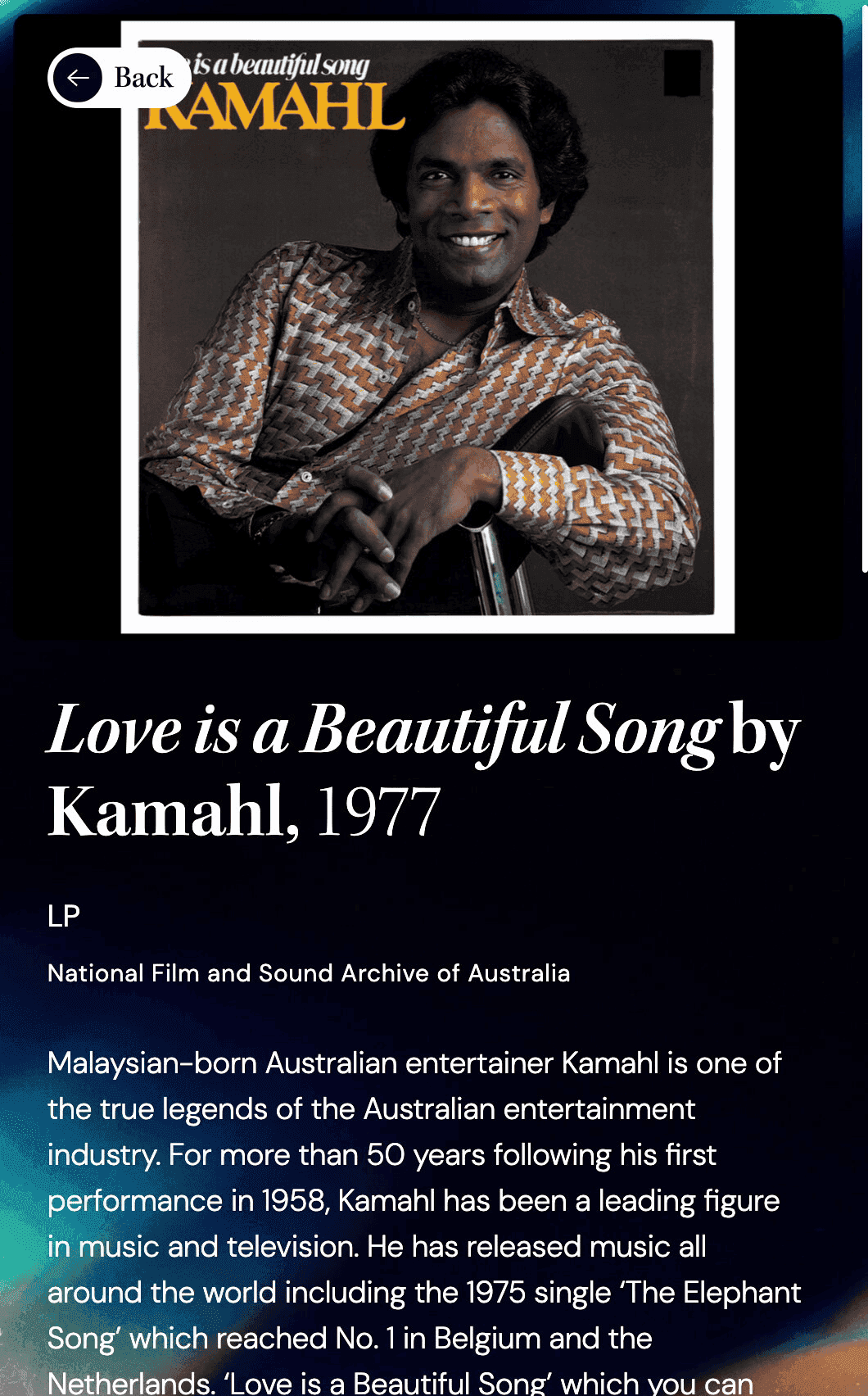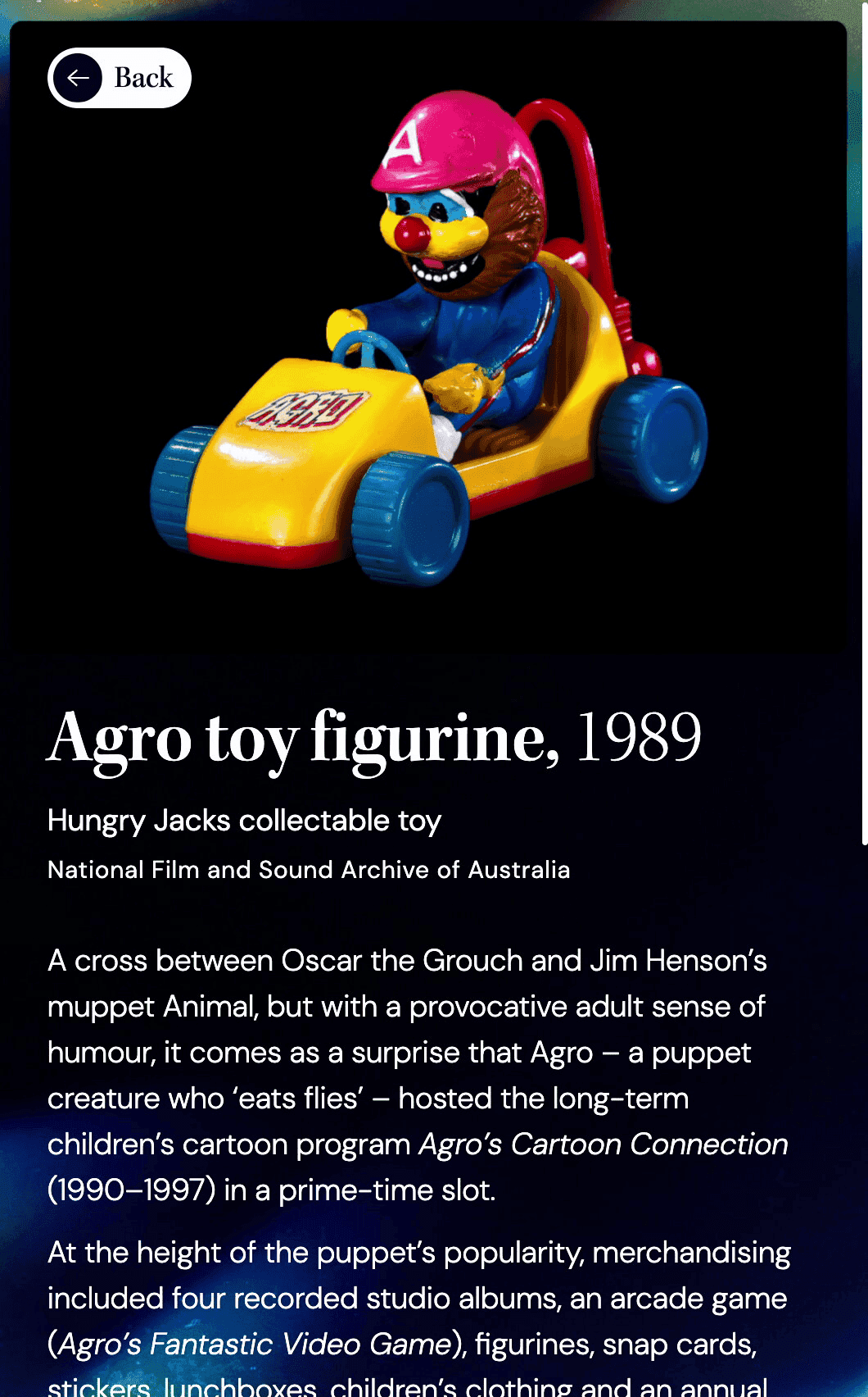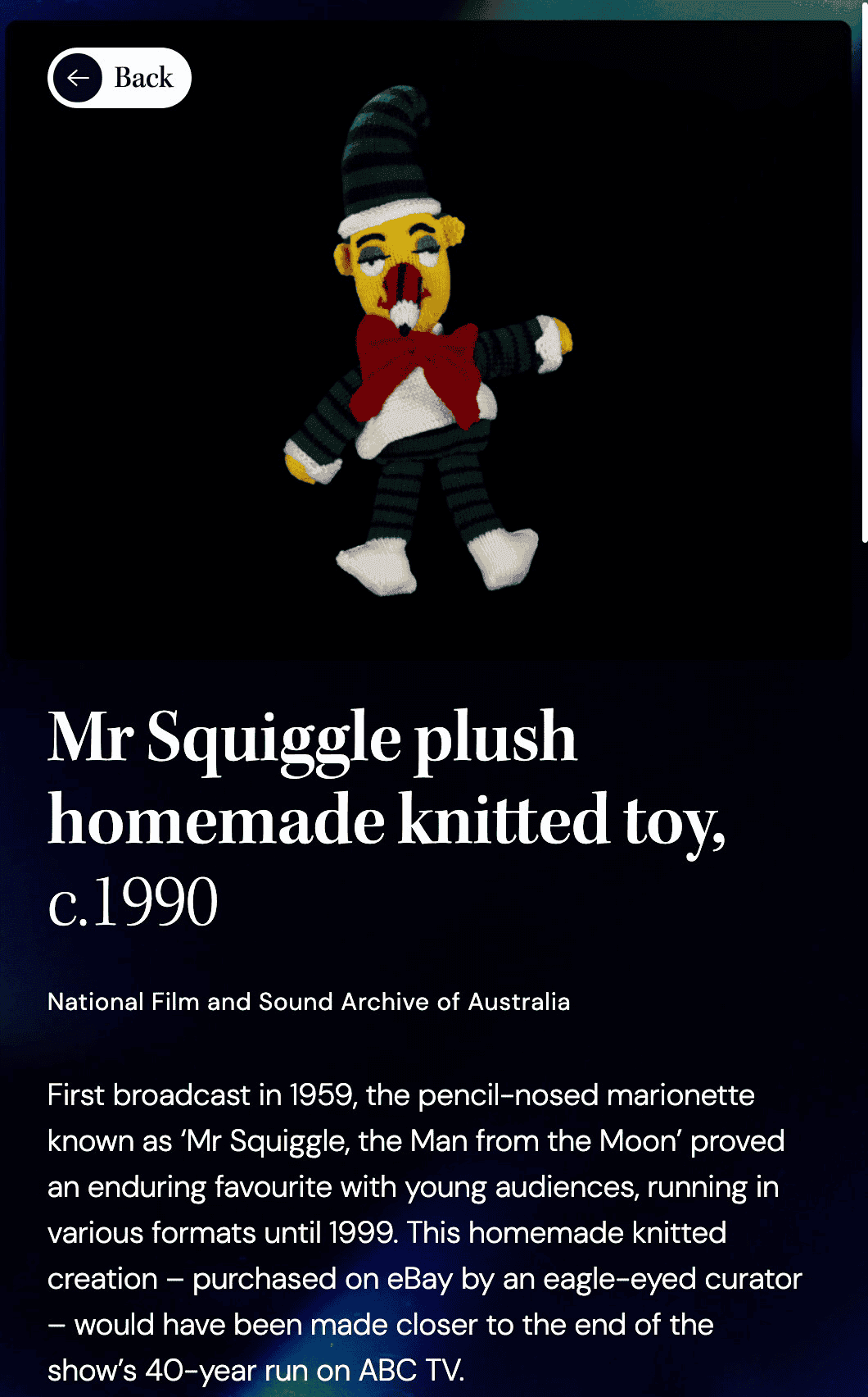 The Library at the National Film and Sound Archive of Australia is a permanent exhibition housing more than 280 artefacts across film, television and sound, interwoven with an interactive layer of touchscreens that form part of the whimsical cabinet-of-curiosities design.