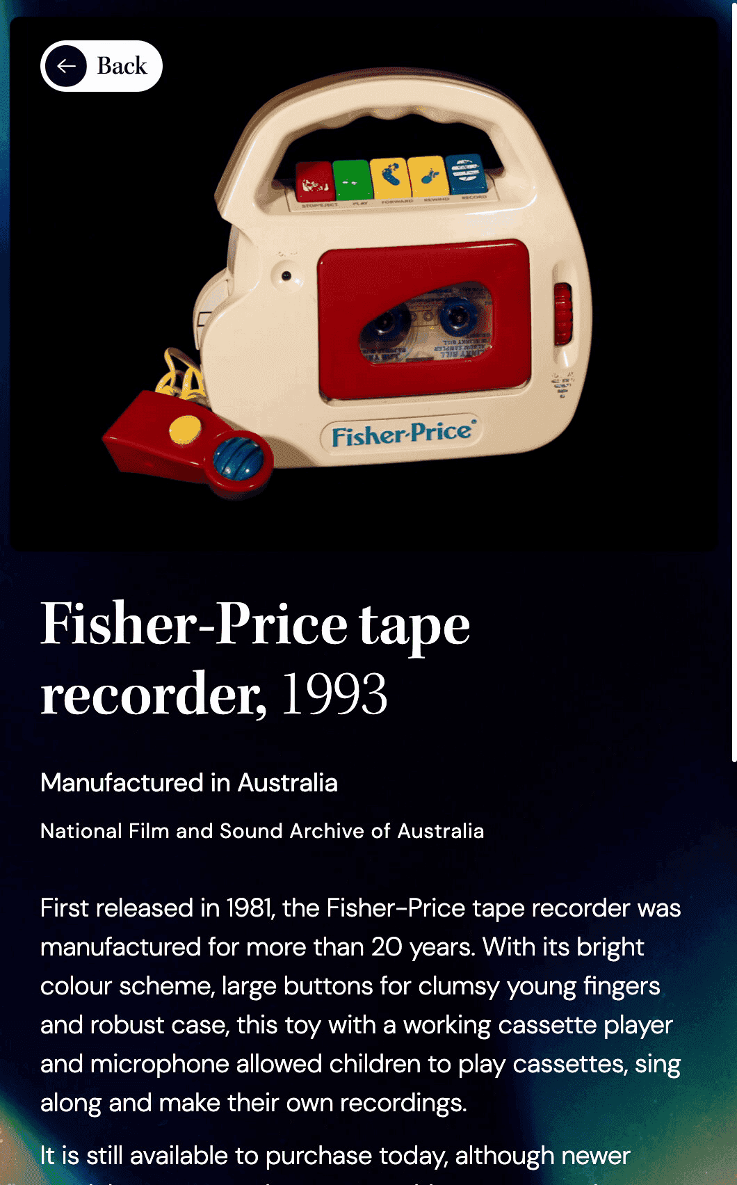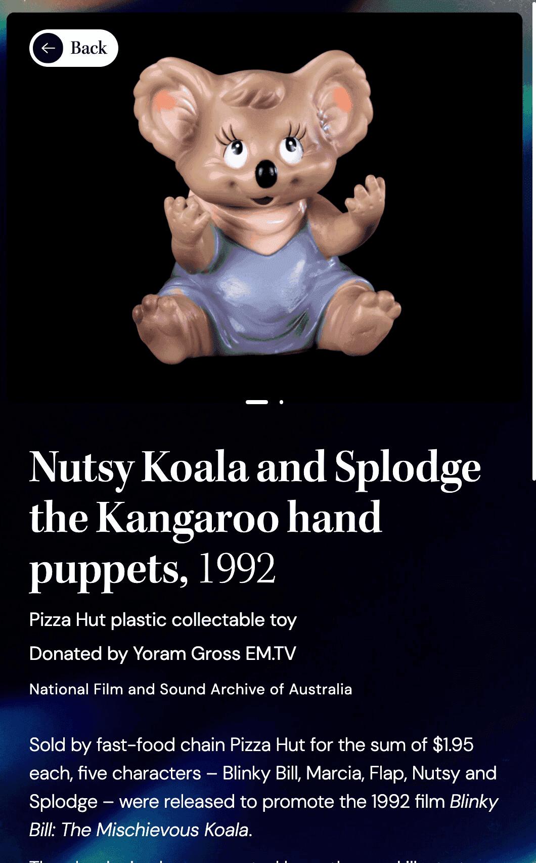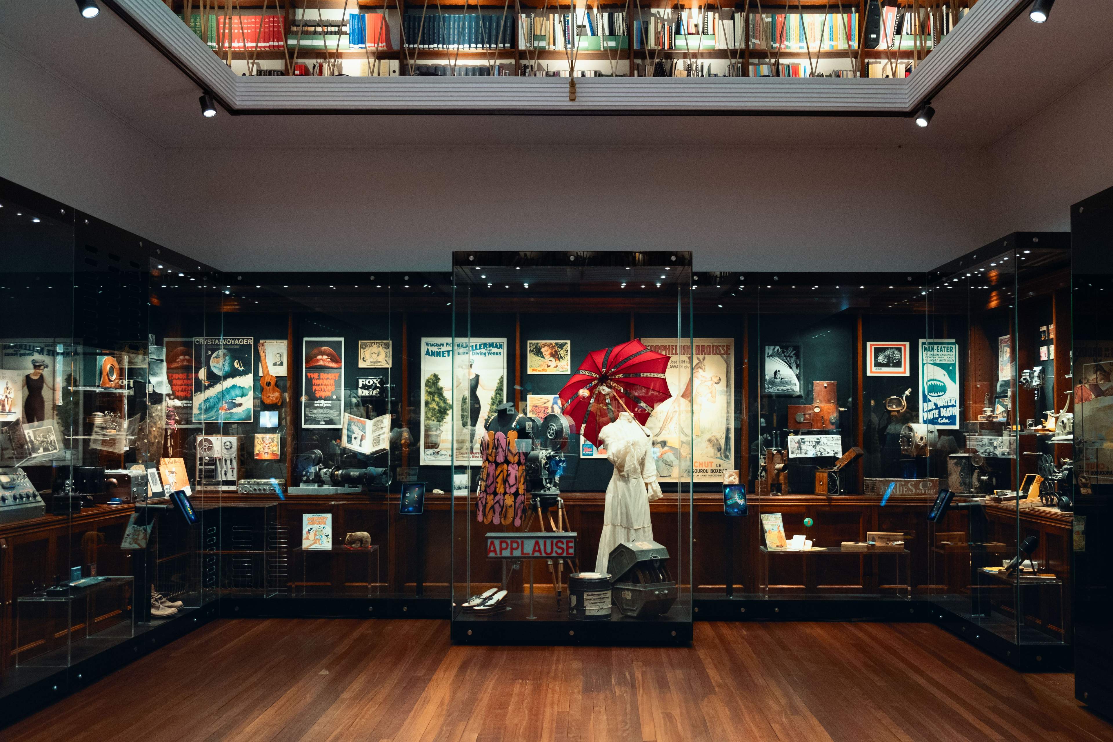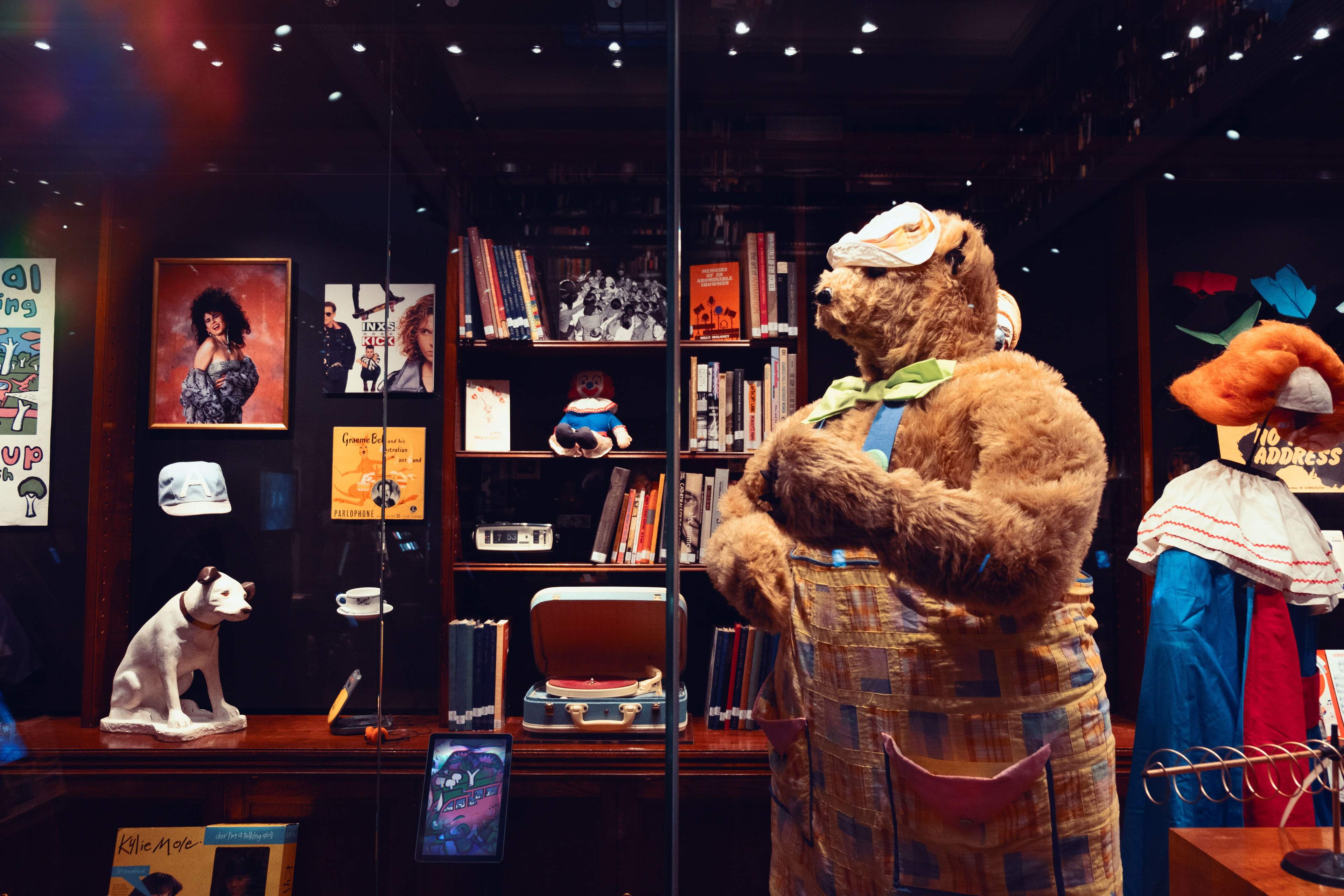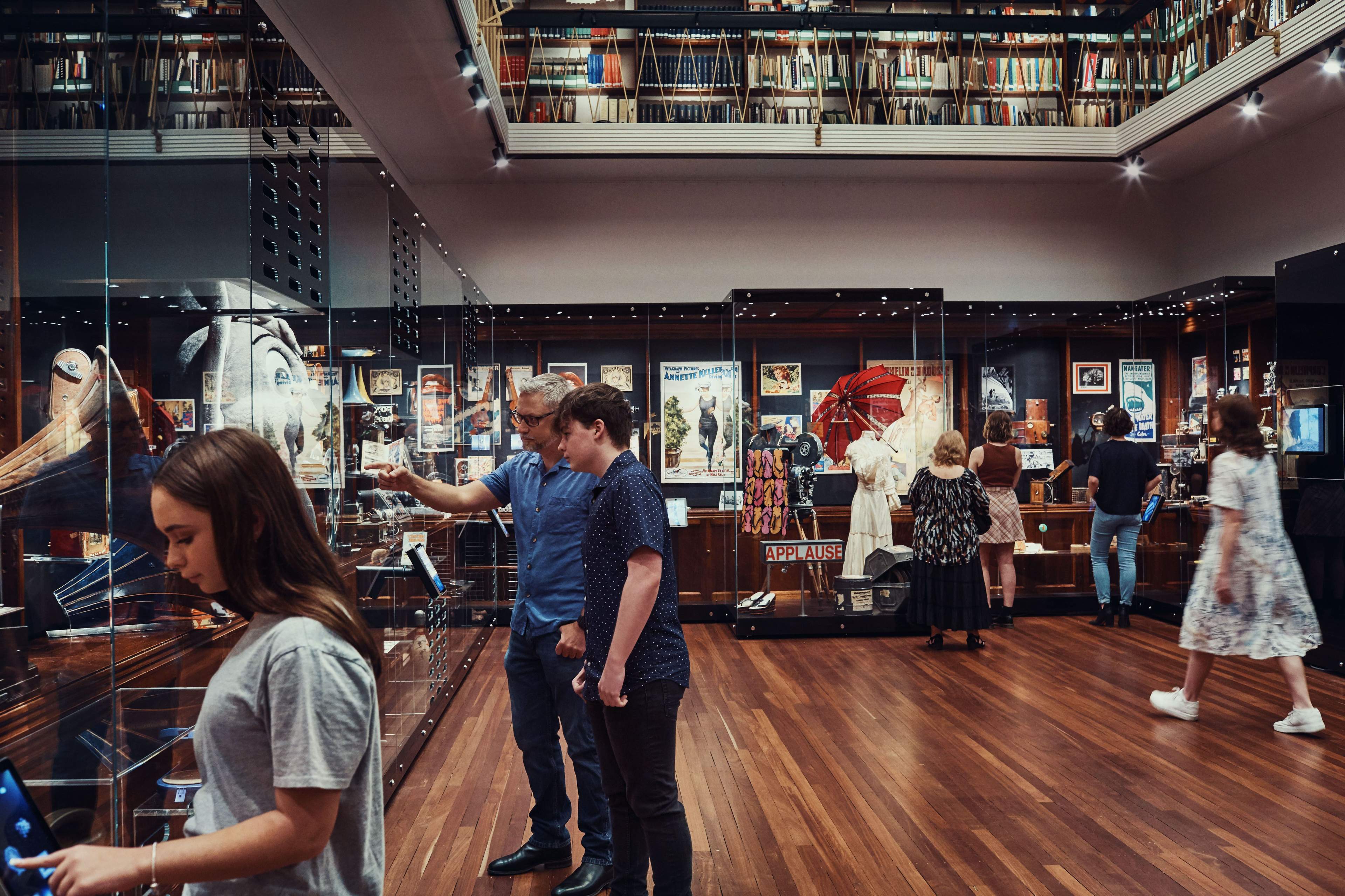 The Library at the National Film and Sound Archive of Australia is a permanent exhibition housing more than 280 artefacts across film, television and sound, interwoven with an interactive layer of touchscreens that form part of the whimsical cabinet-of-curiosities design.